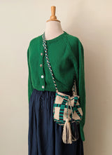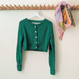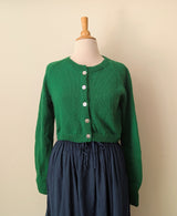Auntie Oti hand knit cardigan, made to last for years. Cropped length makes it easy to layer over our dresses and shirts. Full fashioned raglan sleeves, extra long rib cuffs, seamless neckline finishing, grosgrain ribbon trim at inner front edges, shell buttons.