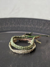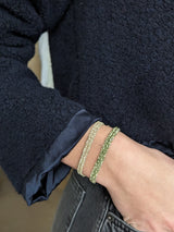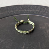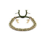 Hand-braided bracelet with forçat Sterling silver chains and twisted kaki color silk yarn finished by little chain fringe and tiny crystal beads. All parts are dipped in yellow gold. Sliding knot closure with 5 cm silk cord on both ends to adjust to any wrist. A casual piece for everyday wear and a perfect gift to express your love.