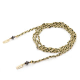 This iconic hand-braided open necklace from Marie Laure Chamorel has forçat Sterling silver chains and twisted silk yarn encrusted with tiny crystal beads. All parts are dipped in yellow gold. You can also wrap this piece around your wrist as a bracelet.