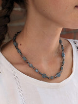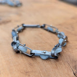 Simple bands of oxidized sterling silver accented with carved texture are linked together on a beaded chain necklace and bracelet. Pale blue aquamarine disks with a soft matte finish are riveted inside the open space of each link, while a hand-fabricated hook clasp closes the chain beautifully.