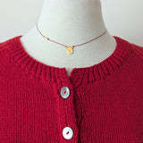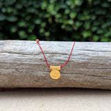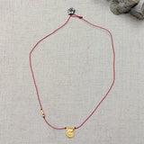 Circle talisman is handmade silver, covered in 24 karat gold. Garnet red nylon, asymmetrical bead detail, pearl flower button closure. Necklace length 16"