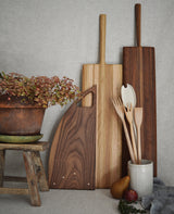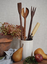 Hand carved clefted scoop from Two Tree Studio. Handle is mostly straight but may have some may have some wonky variations, giving the spoon a beautiful and whimsical appearance. Finished with walnut oil for high-heat cooking, the clefted scoop is available in reclaimed, bleached & whitened spalted maple, walnut (dark) and maple (light).