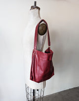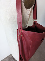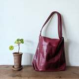 New large carryall leather bag in a simple bucket shape with all the functionalities: two large pockets (including a zippered one inside), a key strap, an adjustable strap that allows you to wear the bag over the shoulder as a hobo or as a cross body bag.   A deep gusset allows you to fit a lot.  Magnetic snap closure.