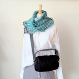 New SizeS!  Slightly larger than the original. This shearling bag reminds you of a little pet,  it's so cute, soft and totally huggable.  It will easily fit your phone, wallet, glasses, a small water bottle and a lipstick. Zipper closure  and adjustable leather strap. Remove the strap and the short handle allows you to carry it over the arm or by hand.