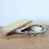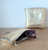 Bright soft gold leather on the outside, natural short hair shearling inside make the cushiest zip pouches! The long one is the perfect size to hold your eyewear while the square on is great to hold a bunch of things. Great for traveling too since a passport will easily fit along a phone charger and whatever else you might need.