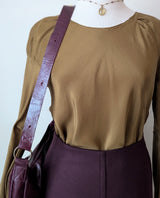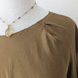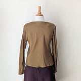 This beautiful long-sleeve top is from German brand Susanne Bommer. The bias cut silk drapes beautifully, especially with the special folded and pleated details at the neckline, hip, and elbows. Shorter in the back with a u-shaped hem in front. Subtle zig-zag hems. Rounded slight drop shoulder.