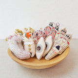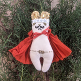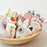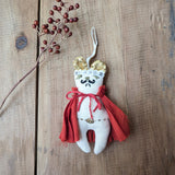 Any Queen fan out there? This quirky little mouse is handmade from a soft cotton canvas using a combination of machine and hand embroidery techniques.Created from original illustrations by New York artist Emma Mierop.  Not two are exactly alike.  Perfect ornaments to put on the tree, hang on the wall or adorn a gift.