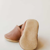 These medium brown leather slip-on baby shoes are complemented by a sandy brown suede sole. Elastic around the ankles helps keep the shoes on securely yet comfortably.
