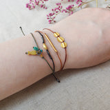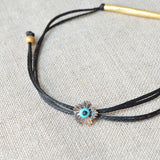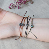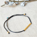 Delicate bracelet made of a thin golden bar threaded over a 7" adjustable jet black cord. 24k gold over sterling silver with a delicate mother of pearl flower button closure. Meant to gently wear and form a time worn patina.