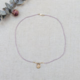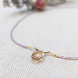 This gorgeous piece features a row of gold vermeil beads with a whiskey quartz pendant in the center of the necklace, and liliac seed beads on the sides. Wear it on its own or mix and match!