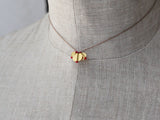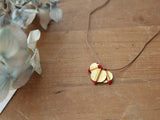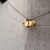 Three handmade silver coins, bathed in 24 karat gold, for good luck. Tiny hematine sparkle, cherry red nylon detail on taupe nylon, with mother of pearl flower button closure. Wear on its own, or layered with other necklaces.