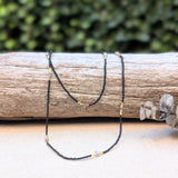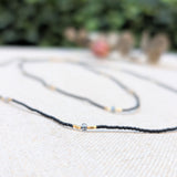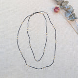 This gorgeous piece features a collection of grey quartz and gold vermeil beads with black seed beads on the sides. Wear it on its own or mix and match!