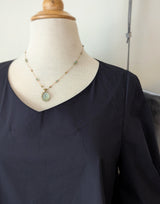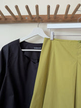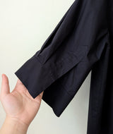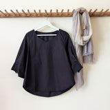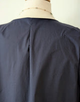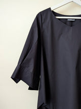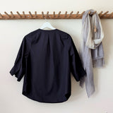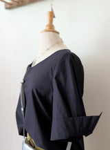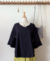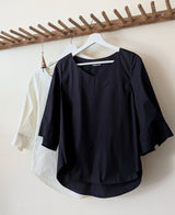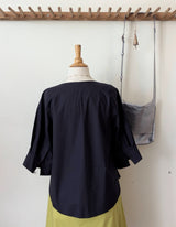 A fresh take on a classic, crisp blouse in a blue so dark it's almost black from German label Susanne Bommer. V-neck with unique stitching details around the neckline, a u-shaped hem, and a pleat on the back. Cropped half-sleeves give a tucked look.