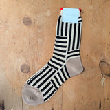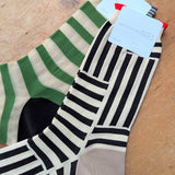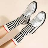 Mixed and matched different stripes create an optical illusion on these comfy crews. The contrast toe and heel plus red tipped cuff add extra graphic appeal!