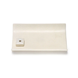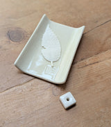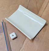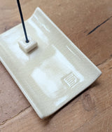 Beautiful little white ceramic plate with incense stand, perfect for holding a stick or cone. The incense plate has a historical Genji incense crest design carved into it. Elegant and minimalist with a glossy cracked glaze finish.