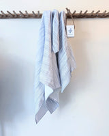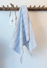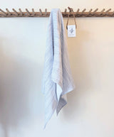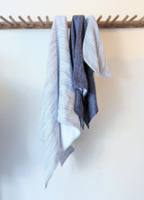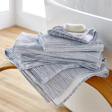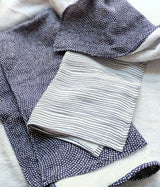 Tradition meets today with these Japanese komon patterned towels. These gauze and pile towels are made to minimize fluff, while maintaining the softness of zero-twist yarn to ensure it feels so lovely you'll want to brush it on your cheek. White with navy blue stripes