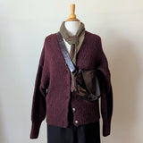 This oversized plush cardigan is by German label Susanne Bommer. Slouchy, drop shoulder fit with hidden snap buttons. More fitted at bottom hem through the hip. Slight balloon sleeve with fitted cuffs. Sure to keep you cute and warm!