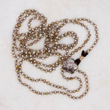 Knotted on taupe nylon, mother of pearl flower button& leather loop closure,14 karat gold details. 43" to be worn doubled