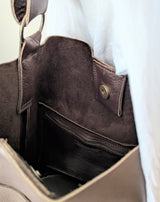 This all-new bucket bag with an adjustable wide strap can be worn on the shoulder or as a crossbody! Handmade of super soft Italian leather in our studio. Two large open outside pockets on the front, plus one inside zippered pocket. Reflective silver interior bottom for easy visibility inside the bag. Magnetic snap closure.