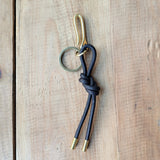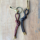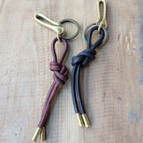 This key chain includes a brass hook, a split ring and a leather tassel with a figure 8 knot. The ends are finished with spent ammunition shells. The long tassel and chunky knot makes it easy to grab and retrieve from a pocket or bag.
