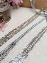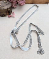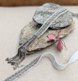 New long Scarf necklace by Parisian artist Marie Laure Chamorel. Mixed metal chains are stitched onto an off white ribbon. Wrap around your neck once or twice to achieve desired look. Length: 110 cm