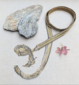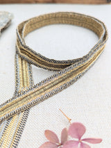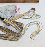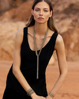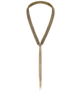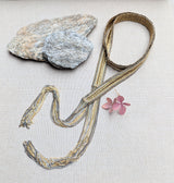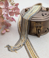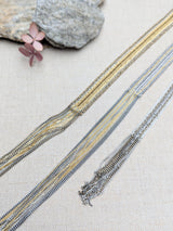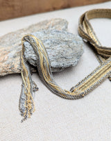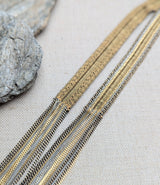Beautiful necklace from Parisian designer Marie Laure Chamorel. Mixed color chains stitched onto a ribbon end in long tassels. Tie loosely around your neck for a scarf look. Also available in Antique Silver.