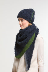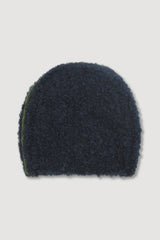 This fluffy hat is made of alpaca and wool. It is a rich navy blue with green accents.