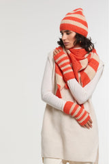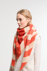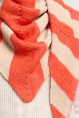 This knit triangle shaped scarf is striped in a soft beige and joyful orange hue. The perfect last touch for a cozy, elevated look.