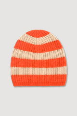 This knit triangle shaped scarf is striped in a soft beige and joyful orange hue. The perfect last touch for a cozy, elevated look.