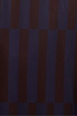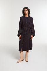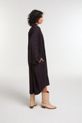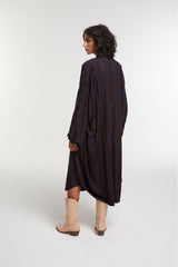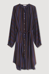 The Paradis Parure Dress has a straight, loose fit and long sleeves. It is a midi length, featuring side pockets and a removable belt. Navy and deep plum stripes printed on viscose.