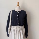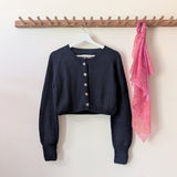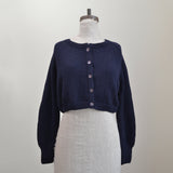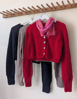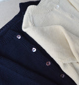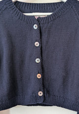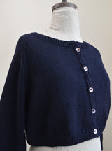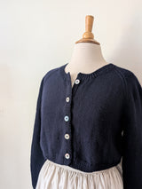 Auntie Oti hand knit cardigan, made to last for years. Cropped length makes it easy to layer over our dresses and shirts. Full fashioned raglan sleeves, extra long rib cuffs, seamless neckline finishing, grosgrain ribbon trim at inner front edges, shell buttons.