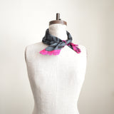 This small scarf is perfect for adding a pop of color to any outfit. Super soft and lightweight, this bandana is so versitile! We love the details on the short edges which are finished with a constrasting strip from upcycled silk saris.