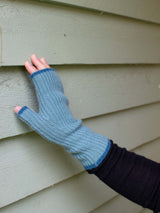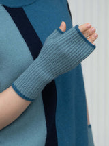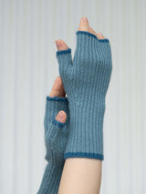 Ribbed Cashmere Fingerless Gloves - Soft Blue with Teal Border