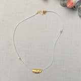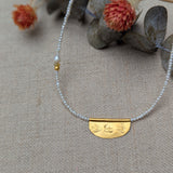 Garden talisman is handmade silver, covered in 24 karat gold. Sacred Seed Talisman, tiny Japanese seed pearl, opal and rice pearl details, hand stamped flower talisman. 17" in length.