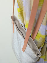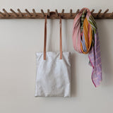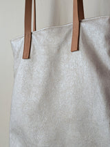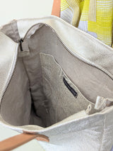This one of a kind tote bag with contrasting shoulder straps is the perfect silvery shade for spring and summer. Made of super soft lambskin. Fully lined with linen with a zipper closure, one internal pocket, and a long key strap. The perfect size for a small laptop or regular sized iPad.