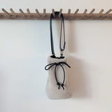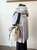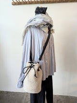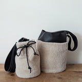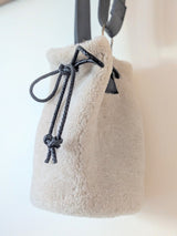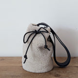 This all-new bucket bag with an adjustable wide strap can be worn on the shoulder or as a crossbody! Handmade of cozy shearling & black pebble leather in our studio. Fully lined with suede. One inside zippered pocket. Cinch the braided round cord at the top to keep the bag closed.