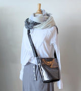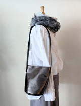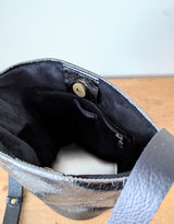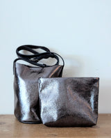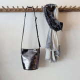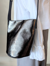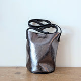 New small bucket bag made of a shiny metallic leather. Perfect for those who like a classic, functional shape but want a bit of sparkle. Contrasting black leather adjustable buckle strap and bottom. Fully lined with black suede. Metallic leather bottom inside to reflect light and allow you to easily see what's in your bag. Inside zippered pocket. Strong magnetic snap closure.