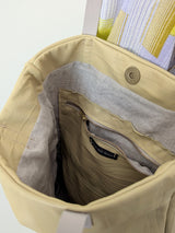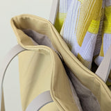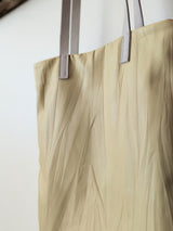 This one of a kind tote bag with contrasting shoulder straps is the perfect pale yellow for spring and summer! Made of super soft washed lambskin with creased detailing. Fully lined with linen, with a magnetic snap closure, one internal zippered pocket, and a long key strap. The perfect size for a small laptop or regular sized iPad.