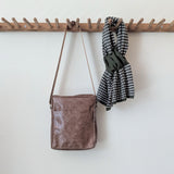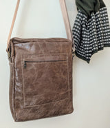 The Bourvil is a clean and classic everyday bag. It has one large pocket on the outside, one zippered pocket in the back, and one inside pocket. Fits an 11" laptop computer or a tablet. Wear it on the shoulder or as a crossbody with the adjustable strap.