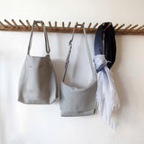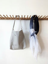 Large carryall leather bag in a simple bucket shape with all the functionalities: two large pockets (including a zippered one inside), a key strap, an adjustable strap that allows you to wear the bag over the shoulder as a hobo or as a cross body bag.   A deep gusset allows you to fit a lot.  Magnetic snap closure.