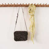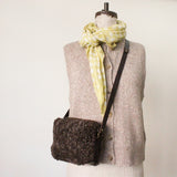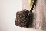Our Lisbon bag now available in a mocha colored curly shearling: sized just to fit your your essentials, large inside phone pocket, zipper closure for safety and adjustable buckle strap.