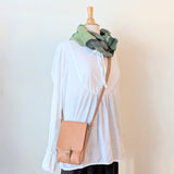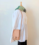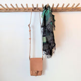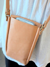 Our new mini messenger but vertical! Made with a slightly stiffer leather but still super light and soft. Large outside pocket on the back side, plus one small pocket for your driver's license and a couple of credit cards on the inside. Fits your phone, a pair of glasses and a lipstick!  Solid brass buckle closure and adjustable trap.