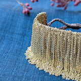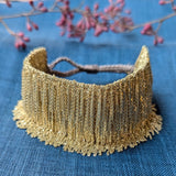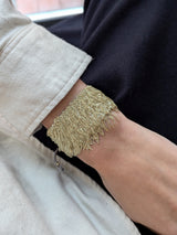 Large woven cuff bracelet with multi-strand chain fringe made of sterling silver chain and grey silk yarn. Easy to wear every day or for evening wear. It will fit perfectly for any occasion and at all wrist with the sliding knot closure and silk thread.