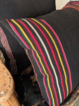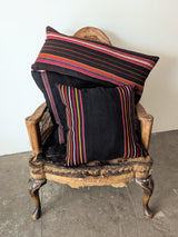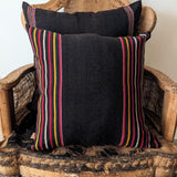 We were very excited to find these one-of-a-kind pillows made of vintage Bolivian ponchos (50-60 years old). Each is made of finely woven wool and has assorted stripes on a dark brown background.