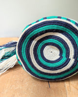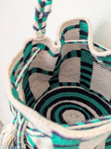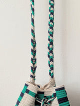 This day-to-day bag is a smaller version of the traditional hand-crocheted Colombian Wayuu mochila. Its fashionable patterns, colors, geometrical shapes, and log-braided handle make this bag a functional product you can wear to match your adventures. The bag closes via a drawstring with colorful tassels.