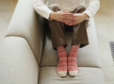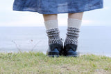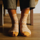 By repeatedly pre-washing the wool yarn, Nishiguchi Kutsushita made these wool jacquard socks almost completely shrink proof. The carefully selected yarn, combined with the jacquard knit, make these socks extra plush and cozy.
