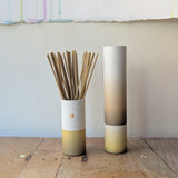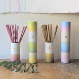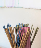 No bamboo core, clean burning scent. Each package includes 30 sticks. Burn time is approx. 25 minutes.