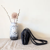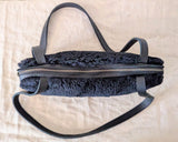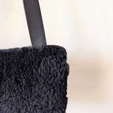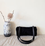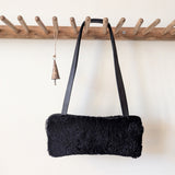 Our baguette bag now available in a black colored curly shearling with black leather: sized just to fit your your essentials, small inside credit card pocket, zipper closure for safety and adjustable buckle strap.