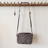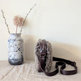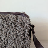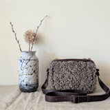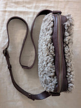 Our Lisbon bag now available in a Latte colored curly shearling: sized just to fit your your essentials, large inside phone pocket, zipper closure for safety and adjustable buckle strap.
