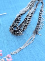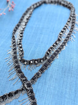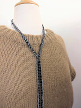 Scarf necklace in brass with a ruthenium finish, composed of a black textile ribbon embroidered with fine chains and adorned in the center with crystal beads. A fringe of delicate chains and chain tassels complete the look of the necklace.